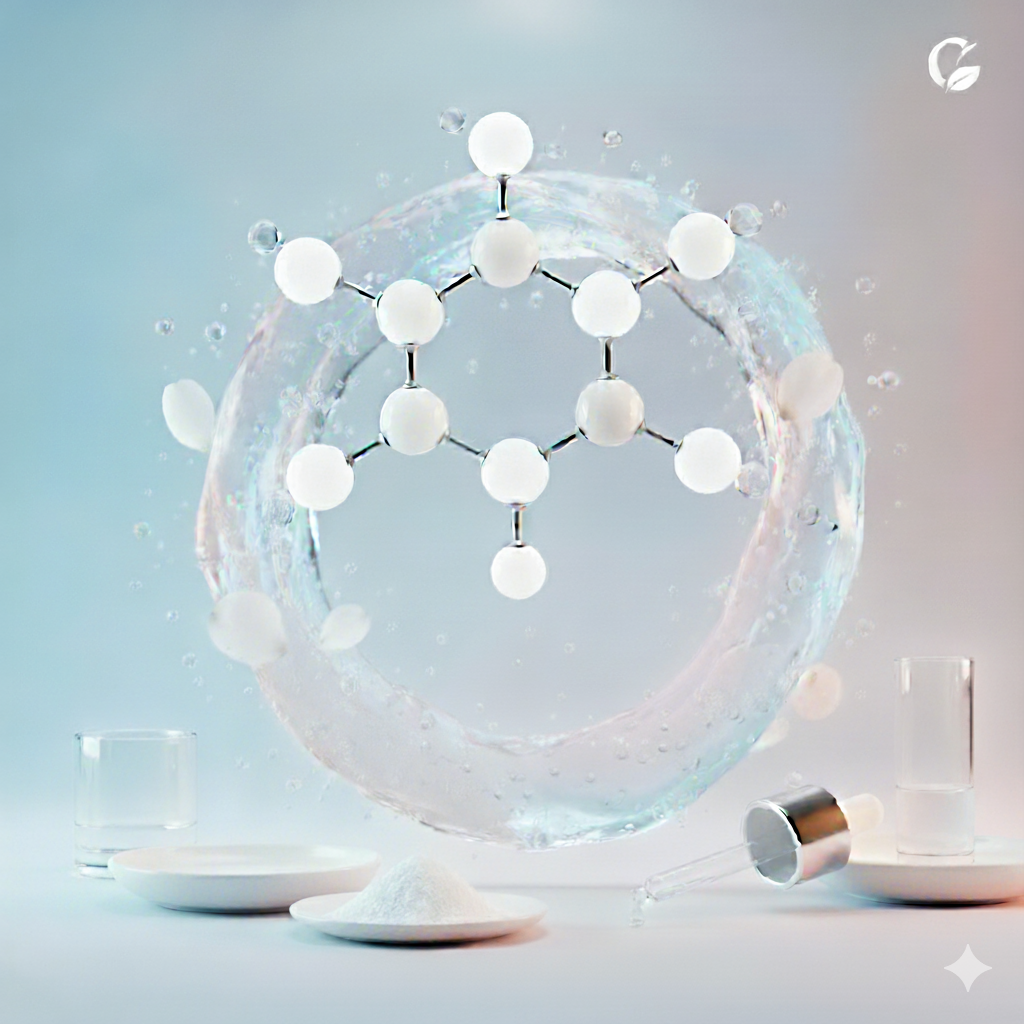 Biotechnologically refined for precision and purity, N-Acetyl Glucosamine is a bio-intelligent amino sugar that harmonizes with the skin’s natural renewal cycle. Acting as a precursor of hyaluronic acid, it enhances hydration, refines texture, and brightens uneven tone through gentle exfoliation without irritation. This next-generation biotech molecule restores clarity, smoothness, and luminosity, redefining radiance through biological synergy.